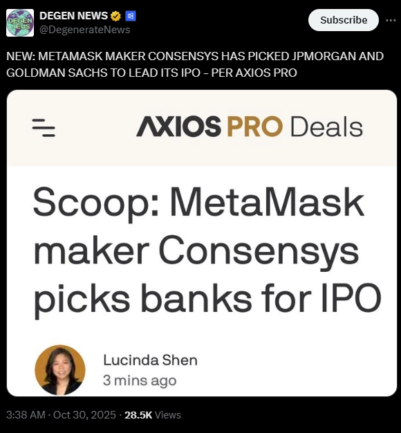 Consensys rõ ràng đang nối gót Circle và Bullish, tận dụng đà hứng khởi của thị trường và sự quan tâm ngày càng tăng của các nhà đầu tư tổ chức đối với cổ phiếu blockchain.