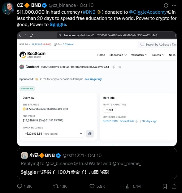 Đến nay, GiggleFund đã quyên góp hơn 11 triệu USD (khoảng 5.000+ BNB) cho Giggle Academy, chứng minh sức mạnh của mô hình “crypto for good” trong không gian memecoin.